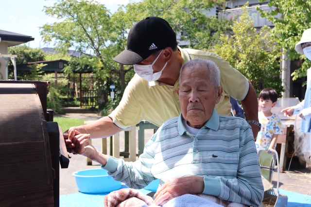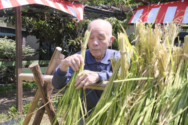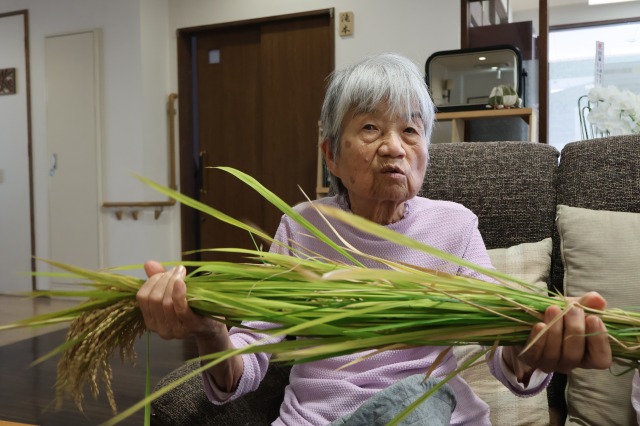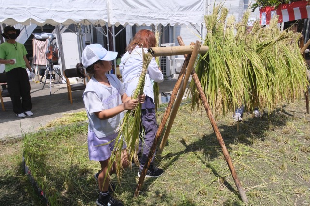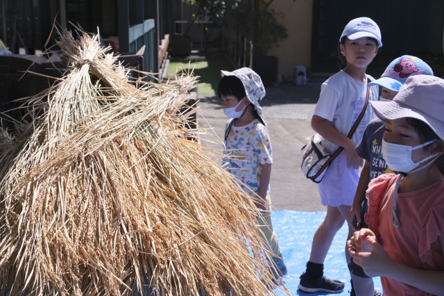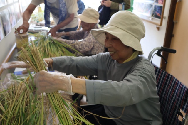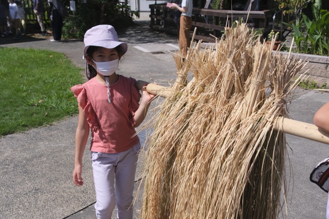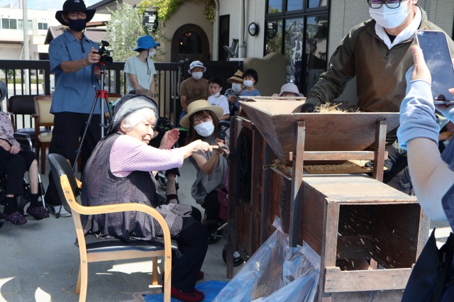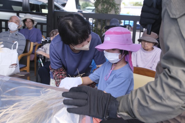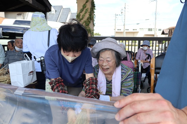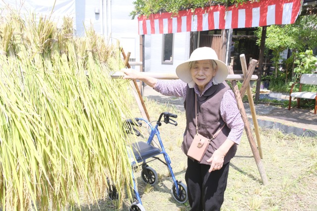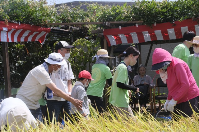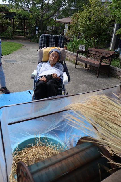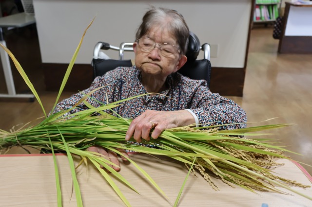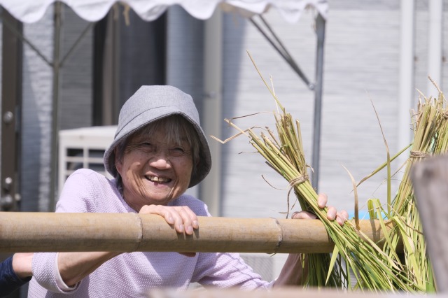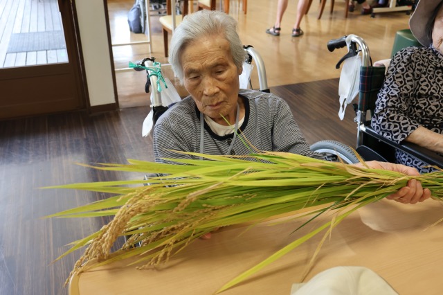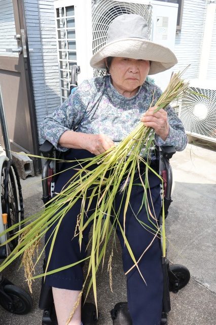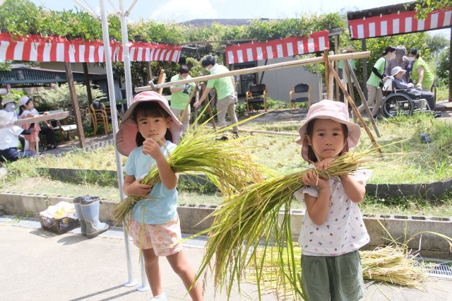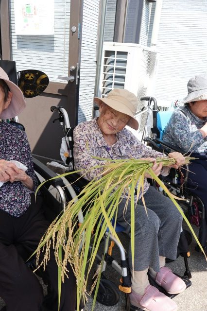 稲刈りでは、8月終わりにも関わらずとても暑い中行いました。入居者様、ご家族様、稲刈りに沢山参加して下さり、特にお子様はとても元気で沢山の稲を刈って下さりました。その後のはざかけも行ってくださりました。