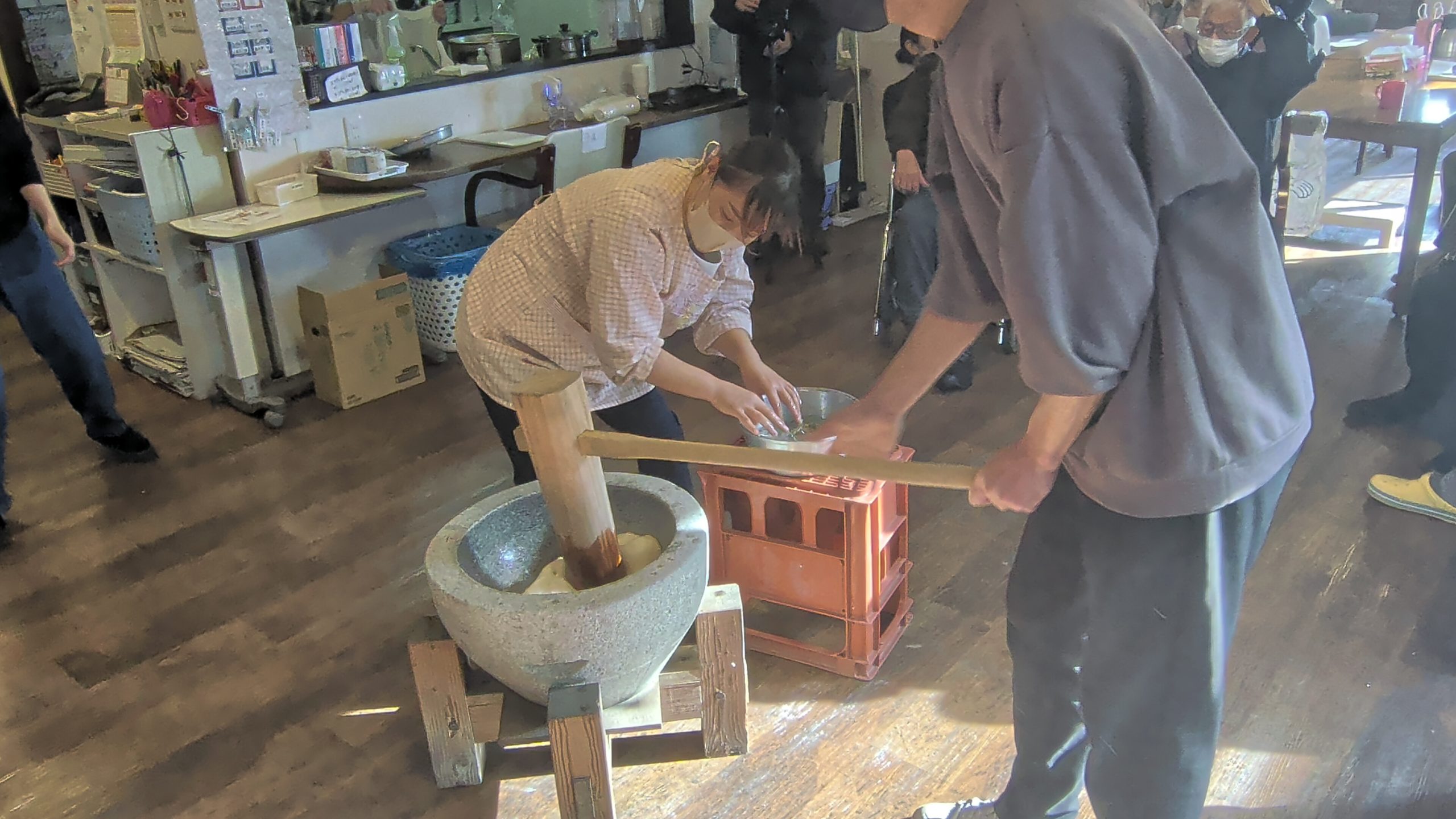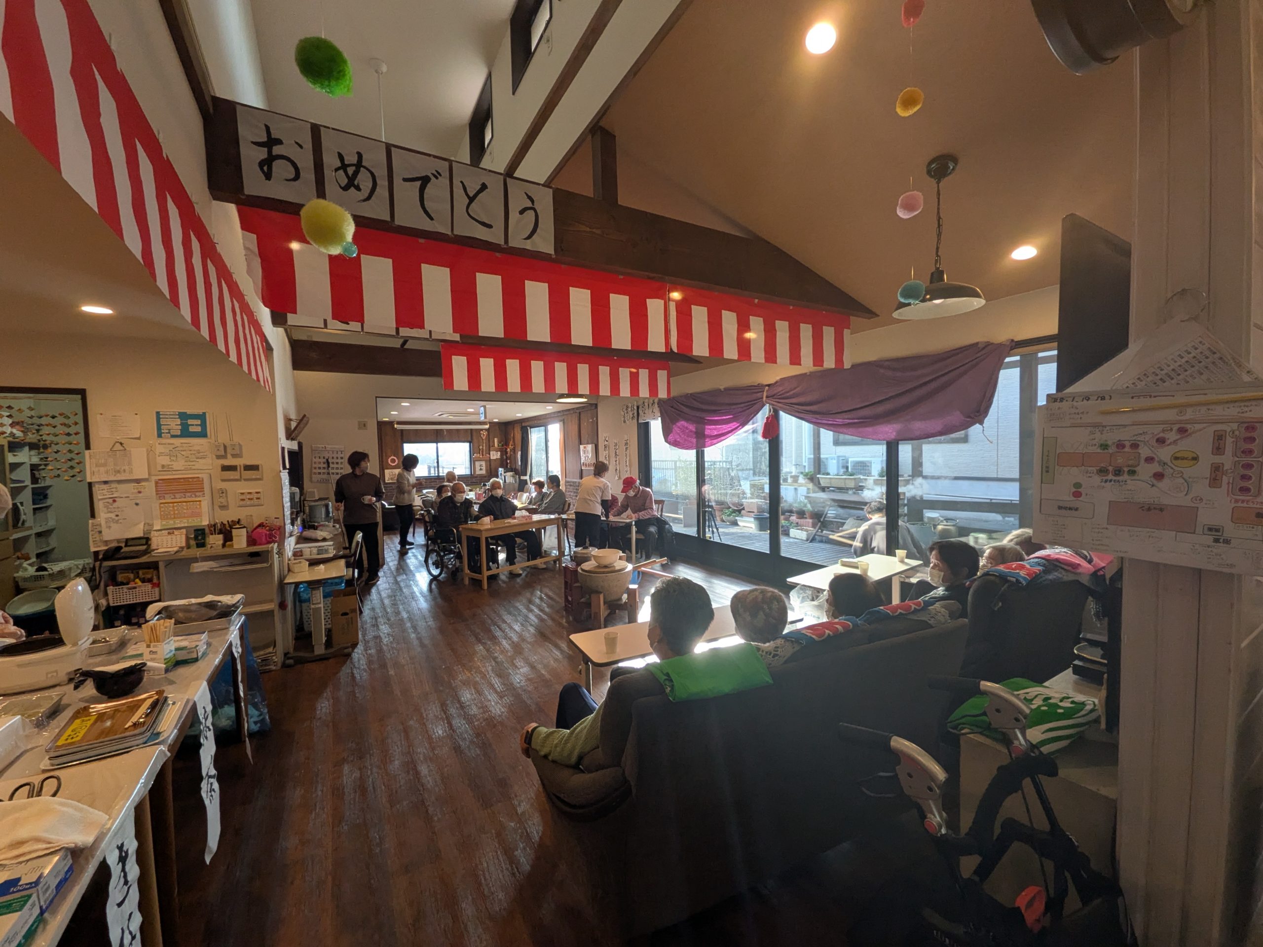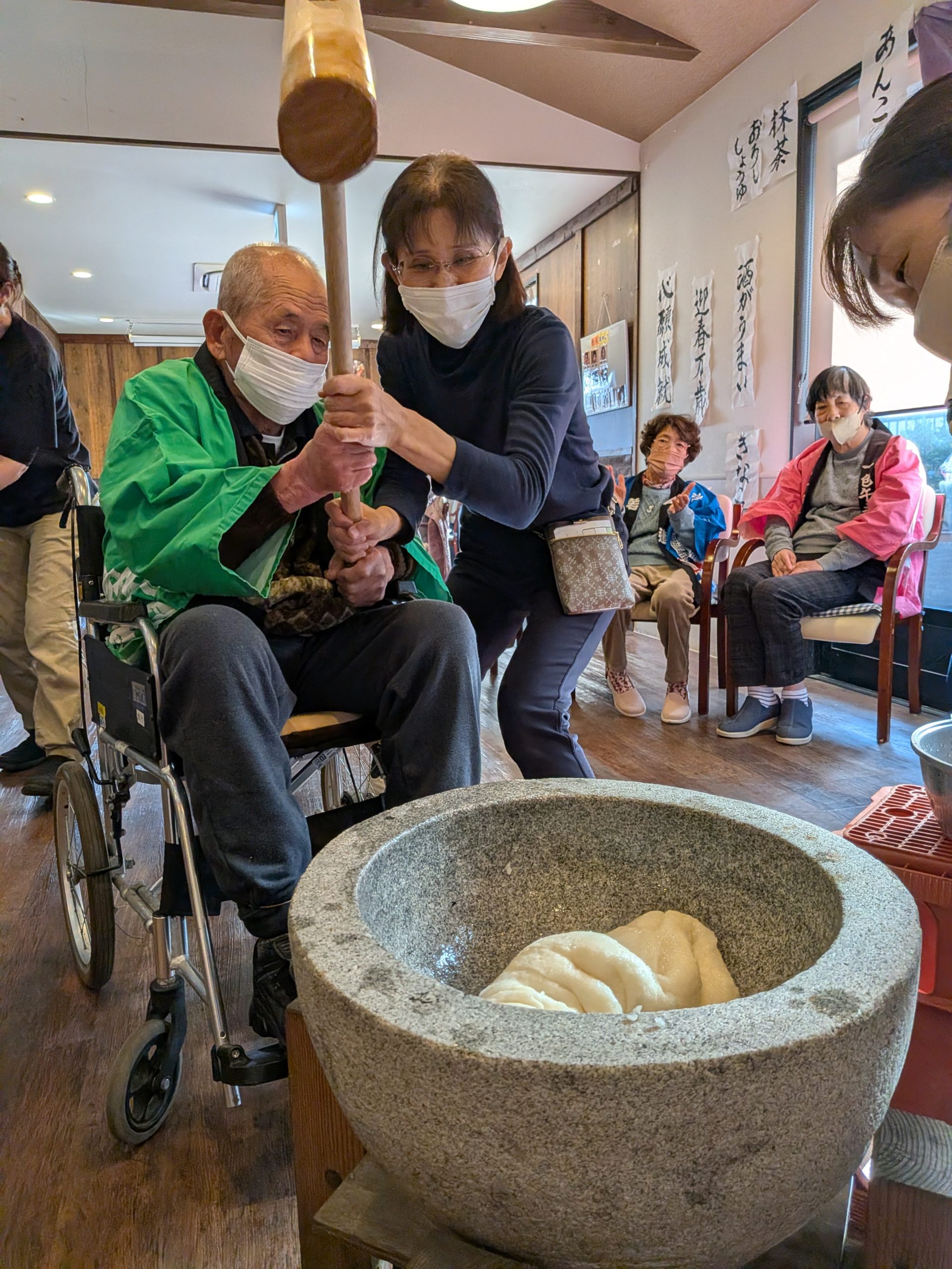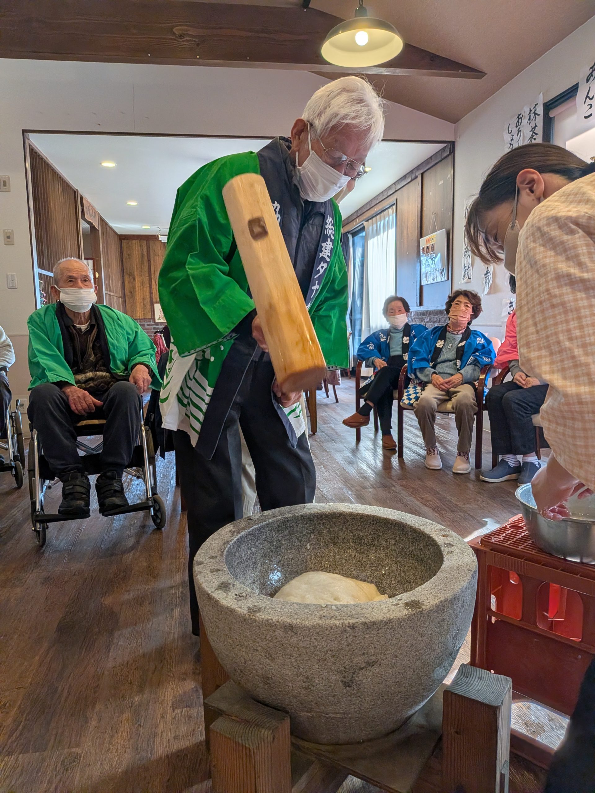 皆さん到着すると、いつもと違う雰囲気に「今日は何があるの?」餅つきと伝えると「楽しみです」と笑顔を見せてくれました。
